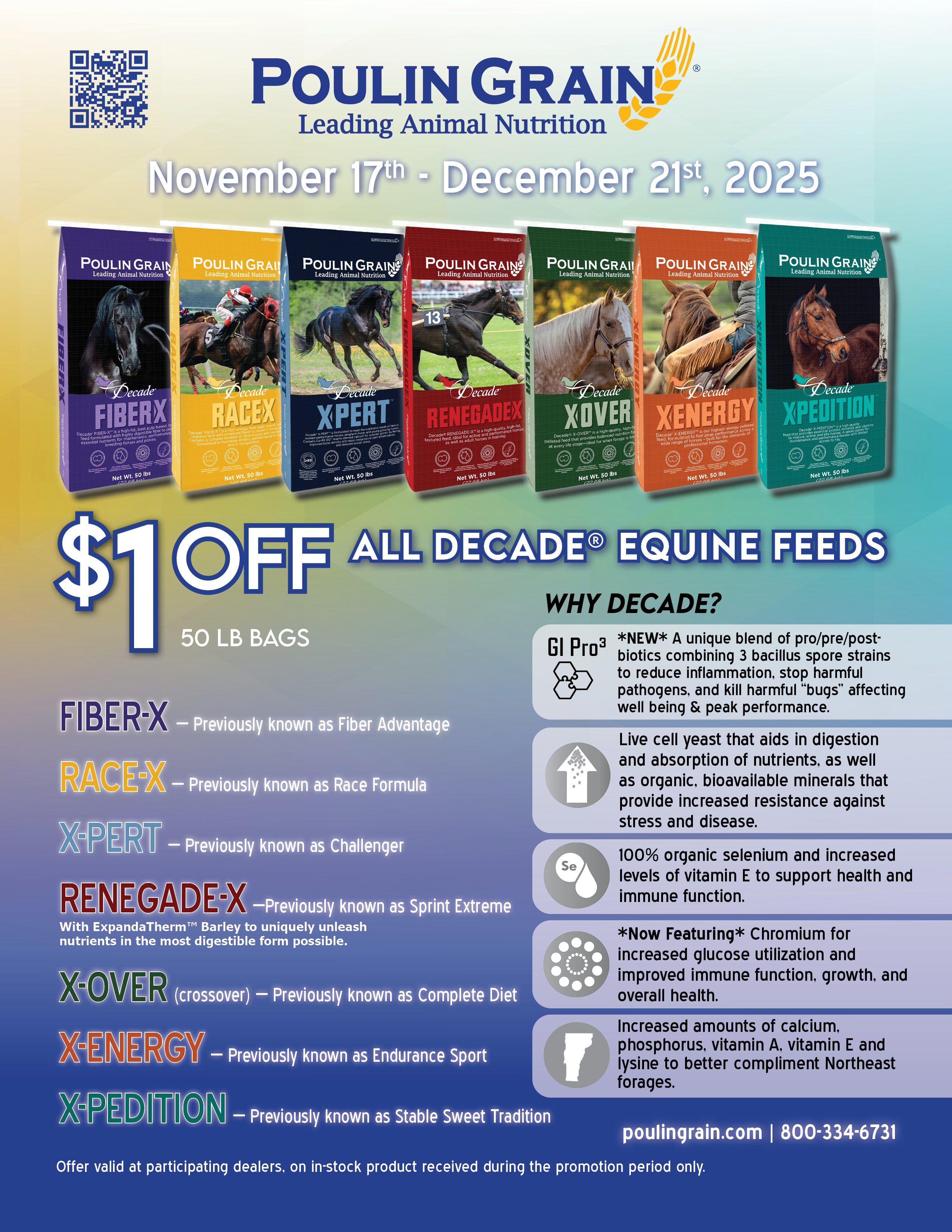 Save $1 on every bag of Decade® Fiber-X, Decade® Race-X, Decade® X-Pert, Decade® X-Pert Super Bites, Decade® Renegade-X, Decade® X-Over, Decade® X-Energy, and Decade® X-Pedition November 17th through December 21st. Valid at participating dealers on in stock product received during the promotion period only. Click HERE to find a dealer near you.